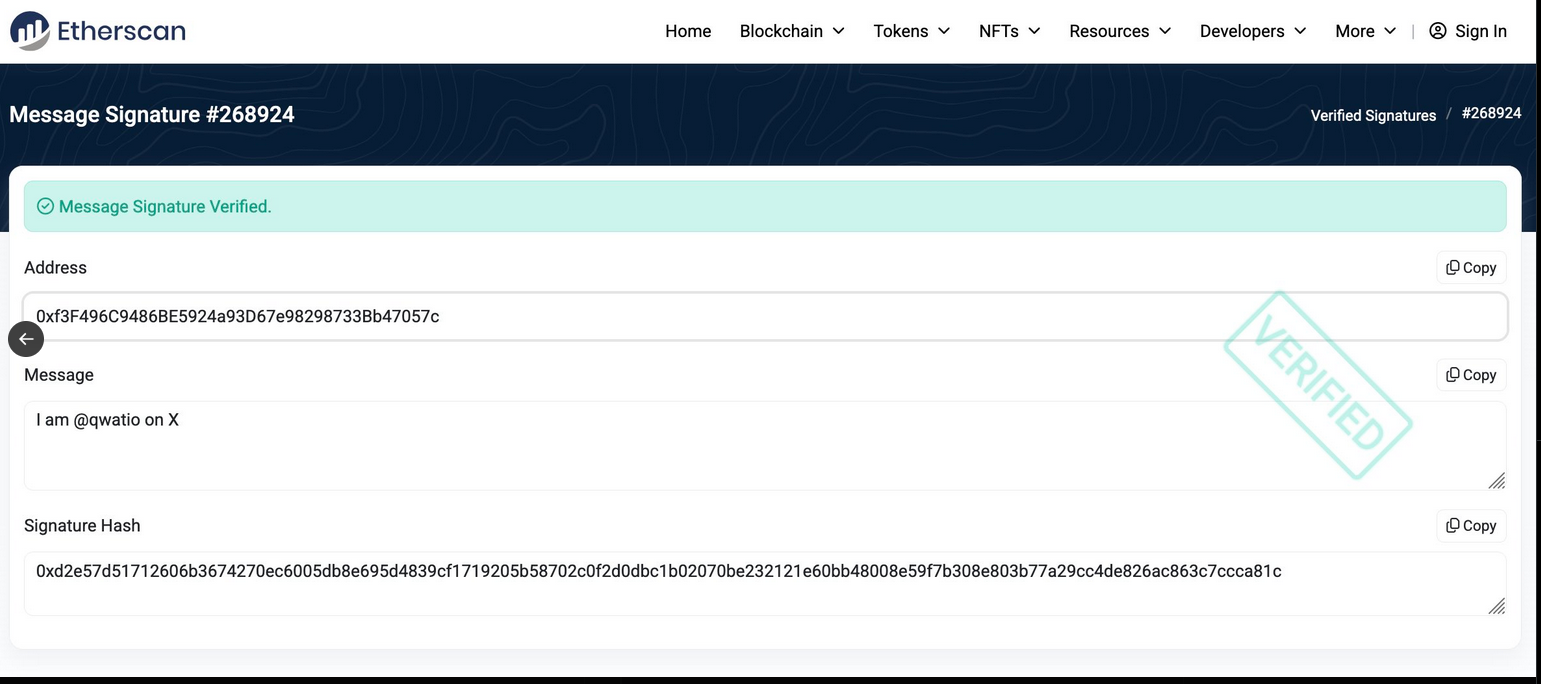 In the shadows of the blockchain, a notorious crypto whale has been making waves with massive leveraged positions that netted over $20M in profits. Intelligence suggests this whale has connections to illegal activities, including exploits against crypto casinos and phishing campaigns. You've been tasked with following digital breadcrumbs to expose this threat actor's identity. Our team has tracked suspicious activity to a cluster of wallets, particularly focusing on wallet addresses connected to the Hyperliquid platform. During our investigation, we discovered this wallet's owner verified their identity through a cryptographic signature that revealed their Twitter handle. Your first task is to locate this critical piece of evidence - find the signature hash that exposed the threat actor's social media presence. Answer format: YAO{signature_hash}