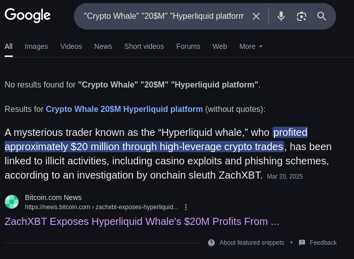 First of all let’s search for this incident. We have some interesting words here “crypto whale, $20M in profits, Hyperliquid platform”